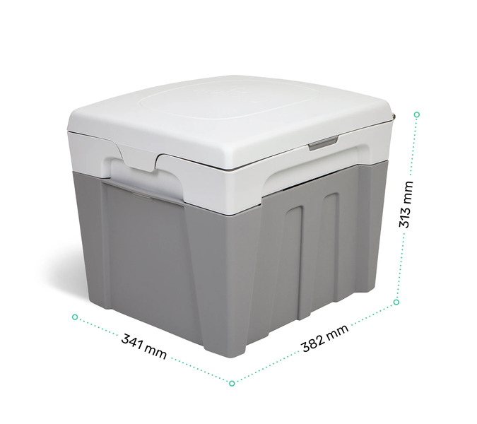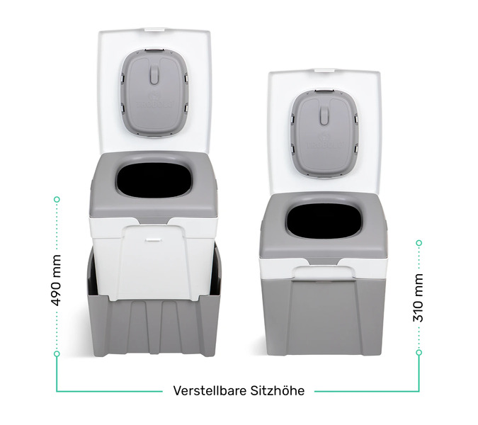 Het toilet kan compact worden opgeborgen en is daardoor ideaal voor gebruik in de camper of bus. Er zijn twee mogelijke zithoogtes voor extra comfort. Daarnaast beschikt het toilet over een geïntegreerde dispenser met daarin toiletpapier en inlegzakjes.