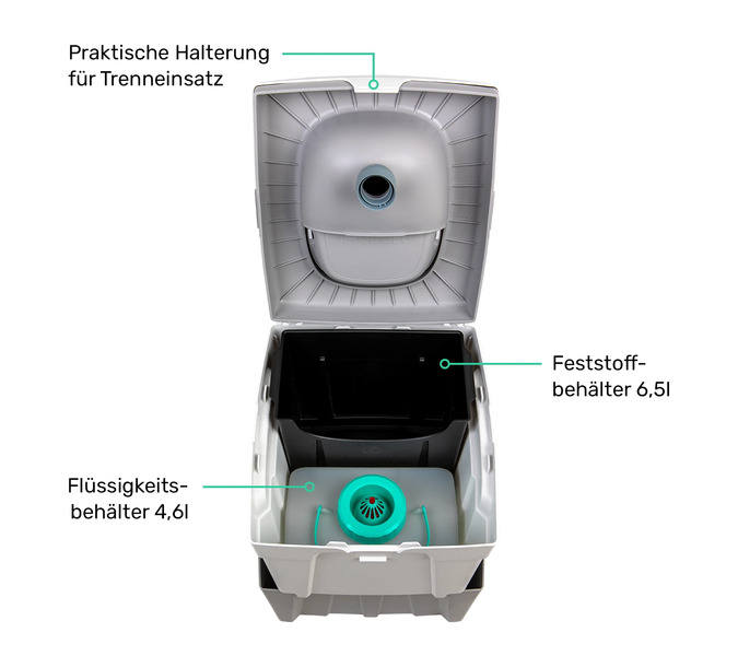 Dit droogtoilet beschikt over een uniek scheidingssysteem dat er voor zorgt dat urine en ontlasting apart wordt opgevangen. Dit zorgt voor aanzienlijk minder stank, want stank ontstaat pas bij het samenkomen van urine en ontlasting.