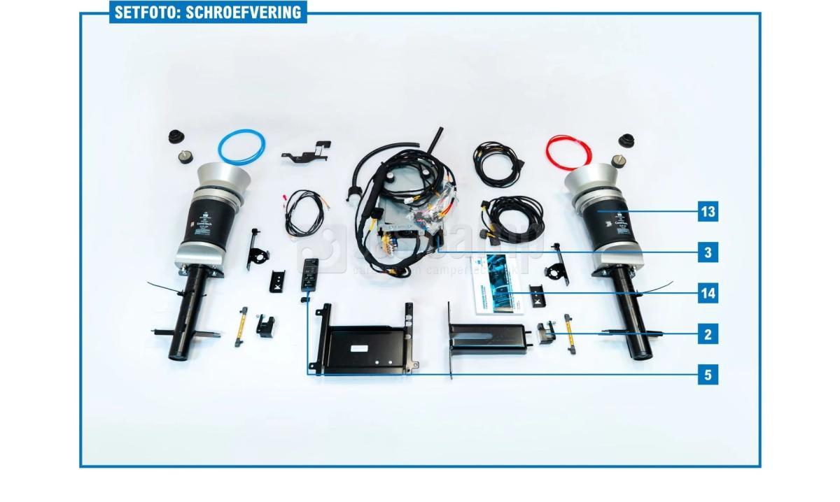 | Omschrijving | Hier worden de originele veren vervangen door comfortabele luchtveerbalgen. Bij de vooras worden de oude veerpoten vervangen door een veerpoot met een nieuwe schokdemper en een luchtbalg. |
